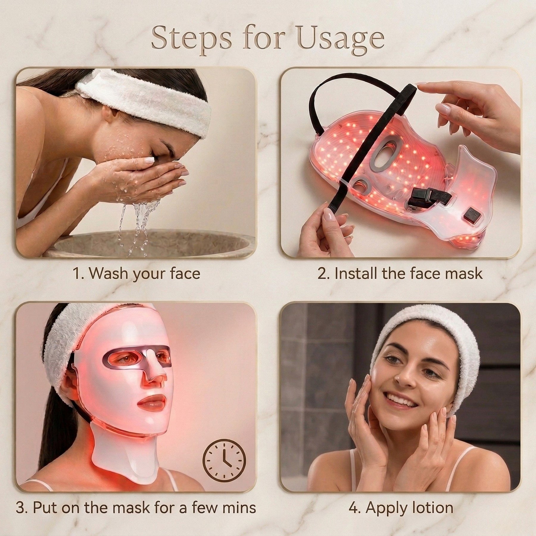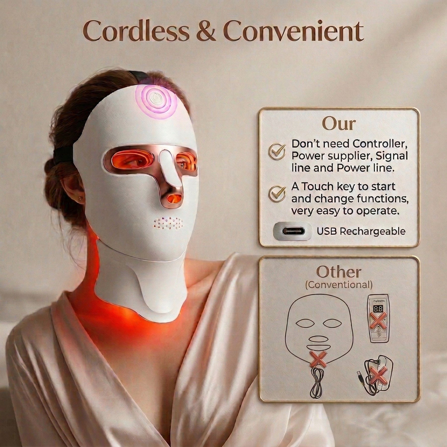 This versatile mask is designed for ultimate convenience. The lightweight, comfortable design allows you to wear it hands-free while working from home, practicing yoga, meditating, reading, or even sleeping. USB rechargeable means you can use it anywhere - no need to be near an outlet. Perfect for busy professionals, frequent travelers, and anyone who wants effective skincare without disrupting their routine.